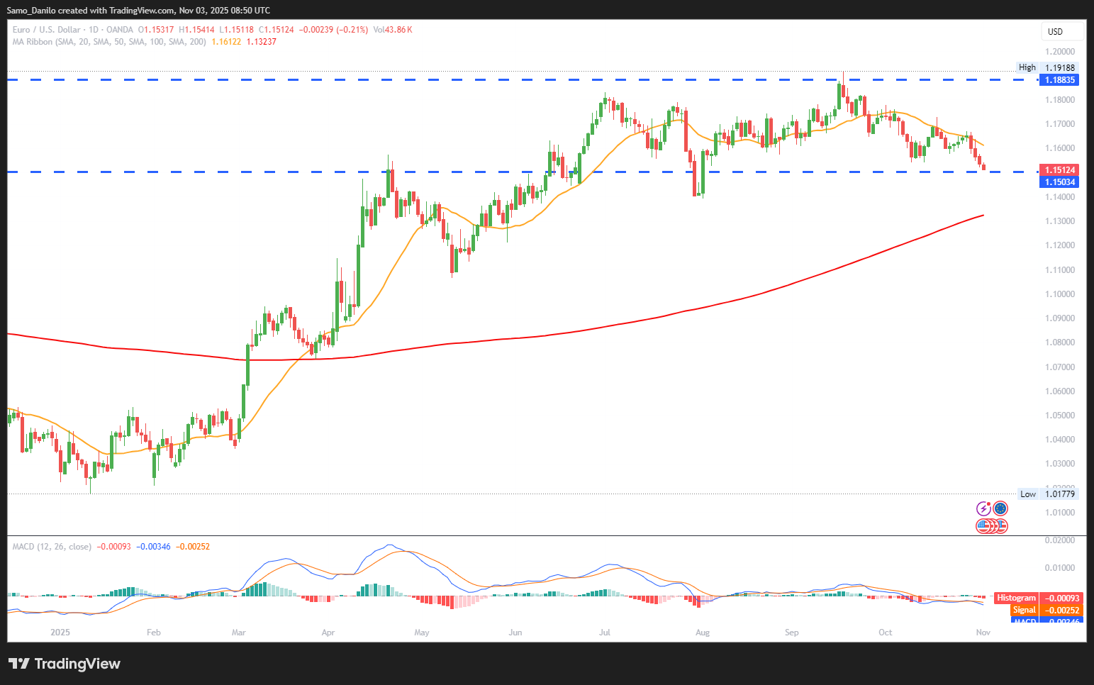- EUR/USD Price: The EUR/USD pair remains range-bound, trading just under 1.1540 during Monday’s European session. The pair’s muted tone reflects a balanced market sentiment, with traders awaiting fresh macro or policy cues to break the narrow consolidation.