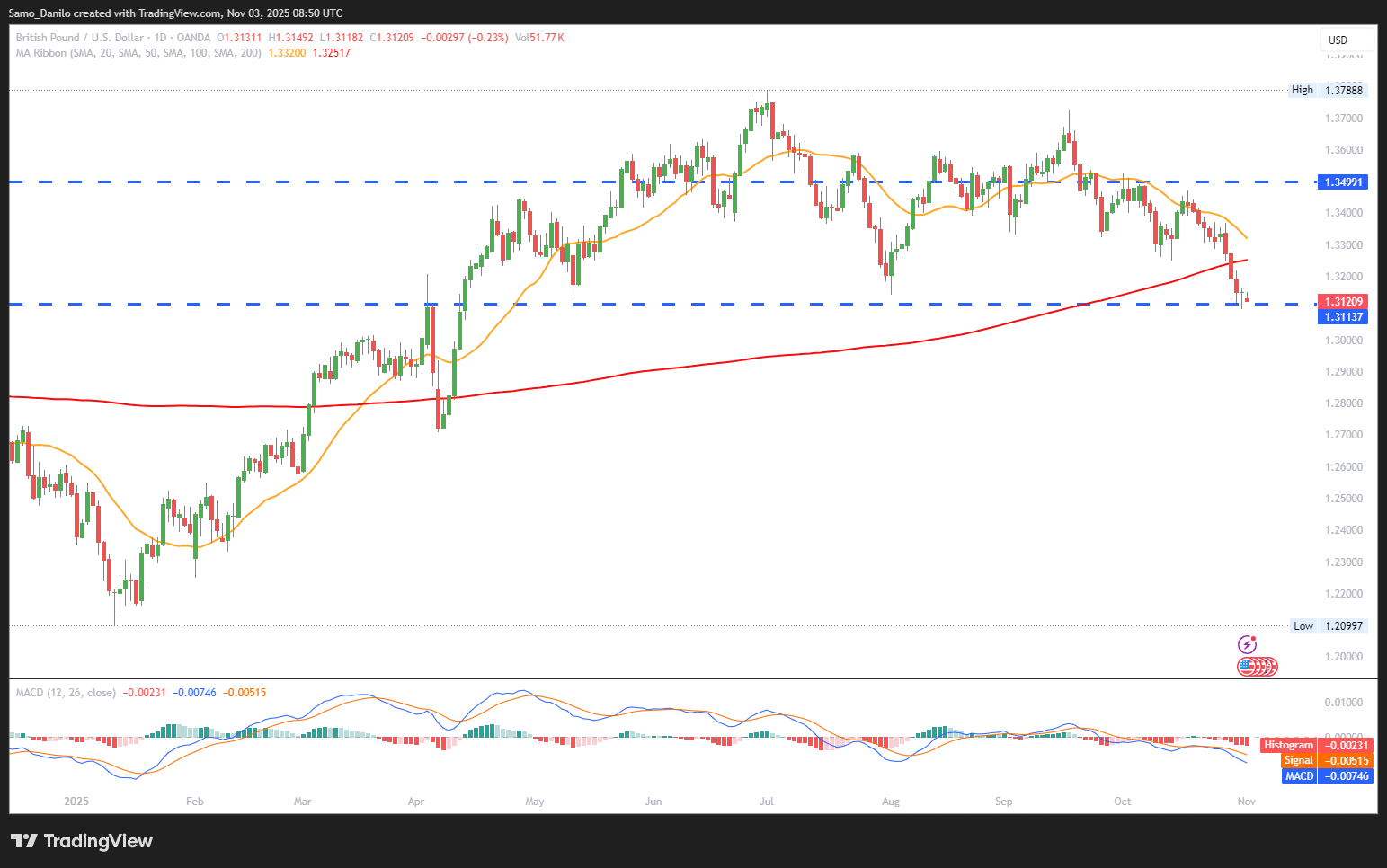 - Fiscal Risks: Growing concerns over fiscal sustainability ahead of Chancellor Rachel Reeves’s Autumn Budget weigh heavily on the GBP. Expectations of higher taxes and slower economic growth are driving investors to trim exposure to UK assets, amplifying downside pressure.