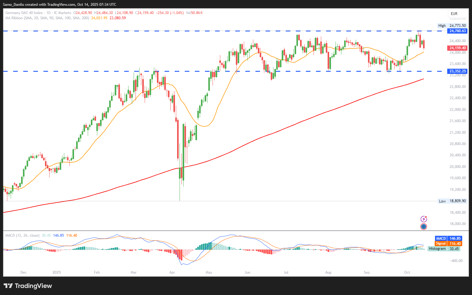 - DAX Price: The DAX is trading around 24,175 points, down 0.98%, reflecting broad risk-off sentiment in European markets. The decline indicates investor caution amid mixed economic and geopolitical signals.