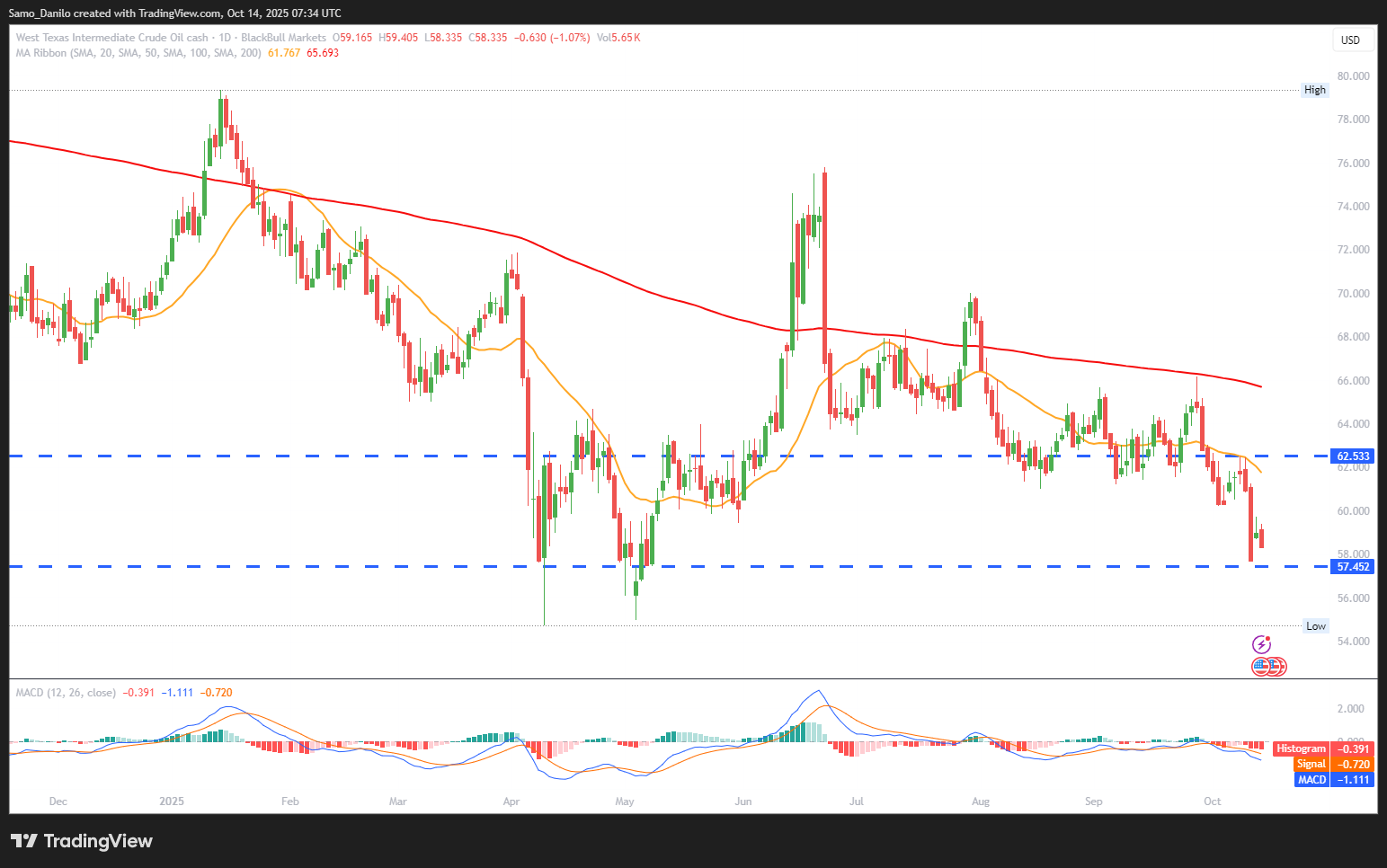 Closing statement: Crude oil prices are softening amid geopolitical volatility and OPEC+’s longer-term production outlook. Near-term momentum leans bearish toward the $58 mark, though escalating conflict or dovish Fed signals could provide intermittent support for WTI.