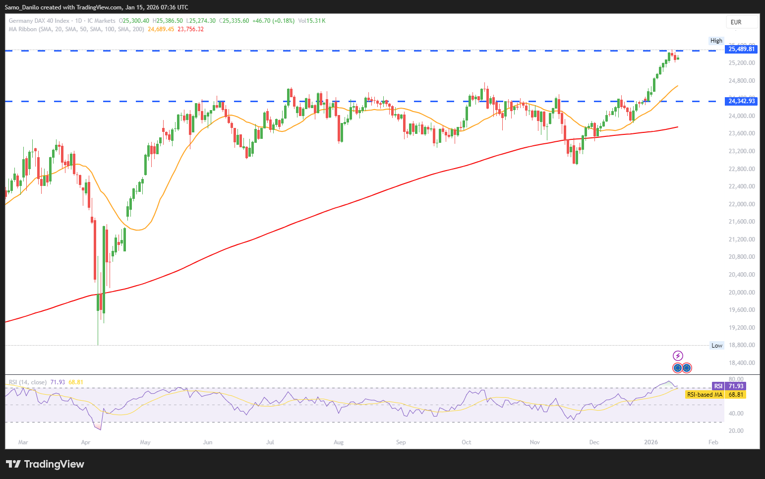 - DAX Price: The DAX is trading around 25,340, modestly higher after a small correction, suggesting consolidation near record territory rather than a trend reversal.