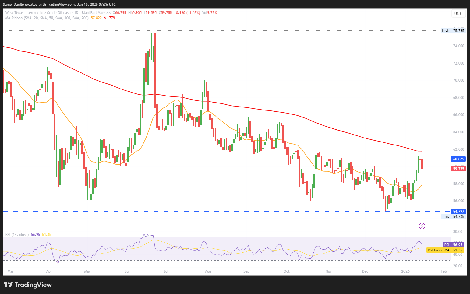Closing statement: WTI remains under pressure from rising US inventories and incremental supply risks, with geopolitical headlines no longer providing strong upside support. As long as prices stay below the $61–62 resistance zone, downside risks dominate, with scope to test $58–59. A renewed escalation in Middle East tensions or a shift back to inventory draws would be needed to restore a more constructive short-term outlook.