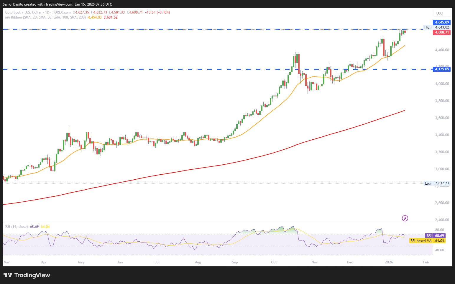 - XAU/USD Price: Gold is pulling back to around $4,610/oz after printing a fresh record high at $4,643, signaling near-term profit-taking rather than a trend reversal.