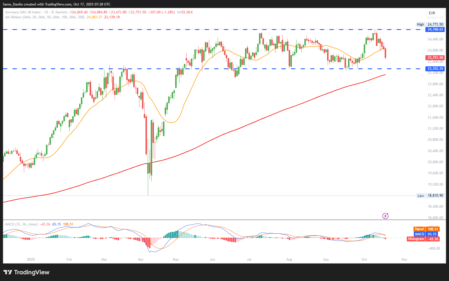 - DAX Price: The German DAX index trades near 23,750 points, extending its pullback after peaking at 24,771 just over a week ago. Investors remain cautious amid heightened global trade and geopolitical uncertainty.