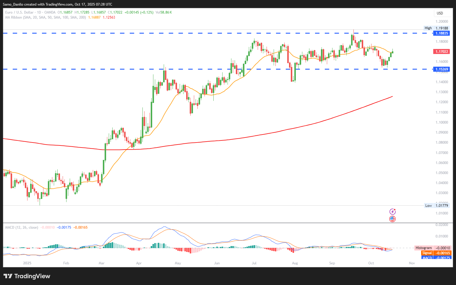 - EUR/USD Price: The euro continues its upward momentum for the fourth straight session, trading near 1.1720 in Friday’s European session. A softer U.S. dollar and steady eurozone sentiment have supported the pair’s climb.