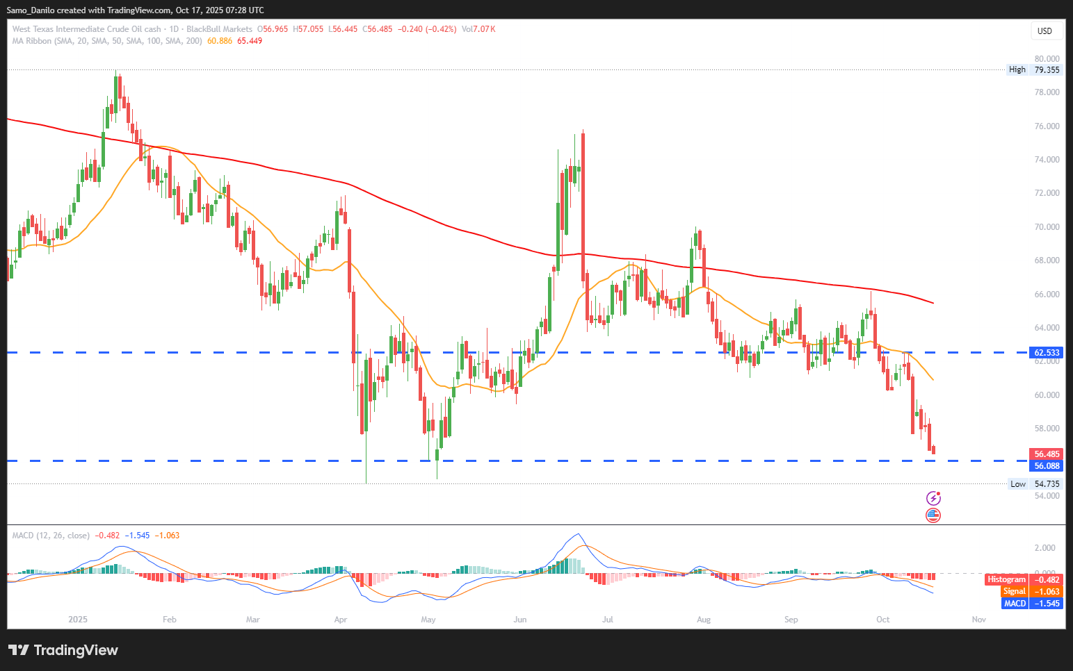 - Crude Oil Price: West Texas Intermediate (WTI) crude slips early Friday in Europe, trading near $56.55 per barrel, extending losses from the previous session amid a fragile risk environment.