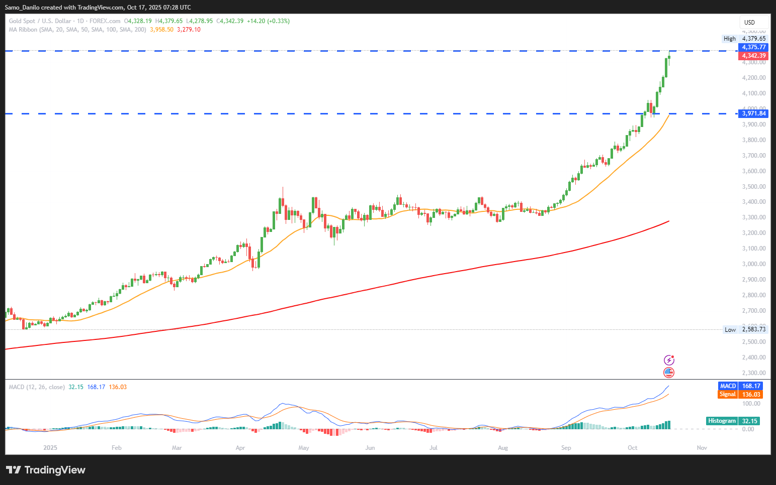 - XAU/USD Price: Gold prices surged nearly 1% to around $4,370 per ounce, marking the metal’s strongest weekly advance in 17 years. The rally is fueled by mounting fears over deteriorating credit quality in the U.S. economy.