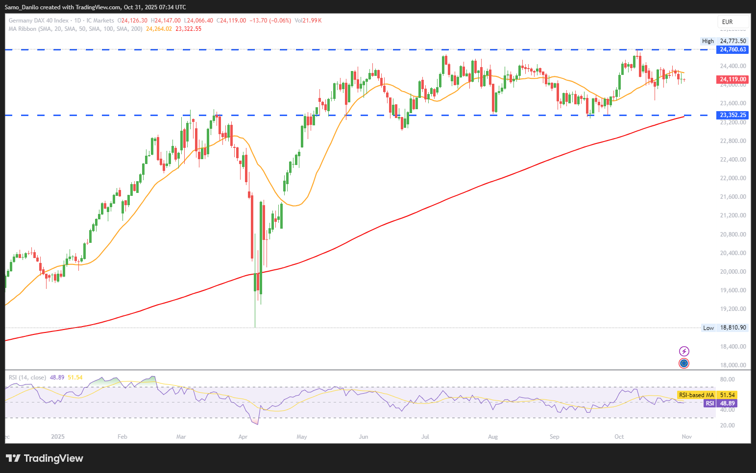 - DAX Price: The German DAX continues to trade in a narrow consolidation range near 24,125 points, maintaining this week’s sideways trajectory. Market participants appear cautious, awaiting stronger catalysts from European macro data and upcoming corporate earnings.