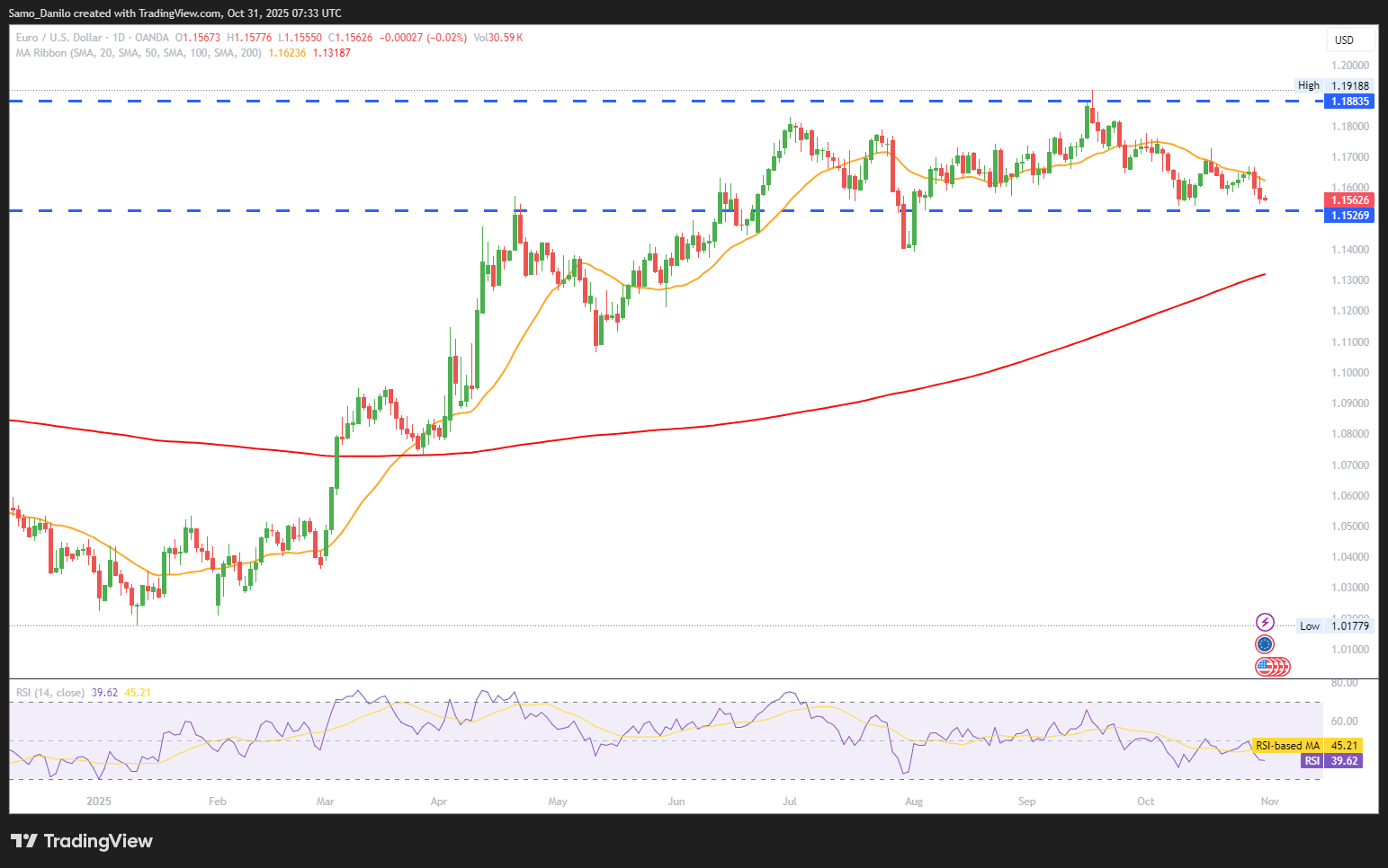 Closing statement: The EUR/USD pair remains on the defensive near 1.1555, weighed by a steady ECB stance and resilient USD demand. Market direction now hinges on Eurozone inflation data, which could determine whether the pair stabilizes above 1.15 or resumes its downward trajectory into next week.
