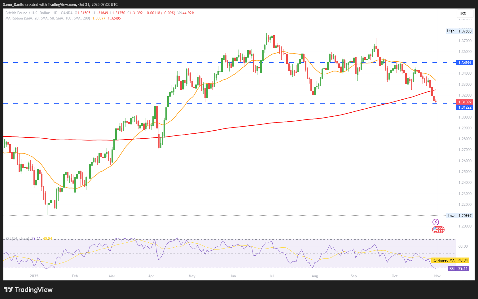 Closing statement: The GBP/USD pair remains pressured around 1.3130, with hawkish Fed rhetoric and rising BoE rate-cut bets keeping Sterling on the defensive. Unless incoming UK data or fiscal signals turn more supportive, the pair could test the 1.3080 support zone before attempting any meaningful rebound.