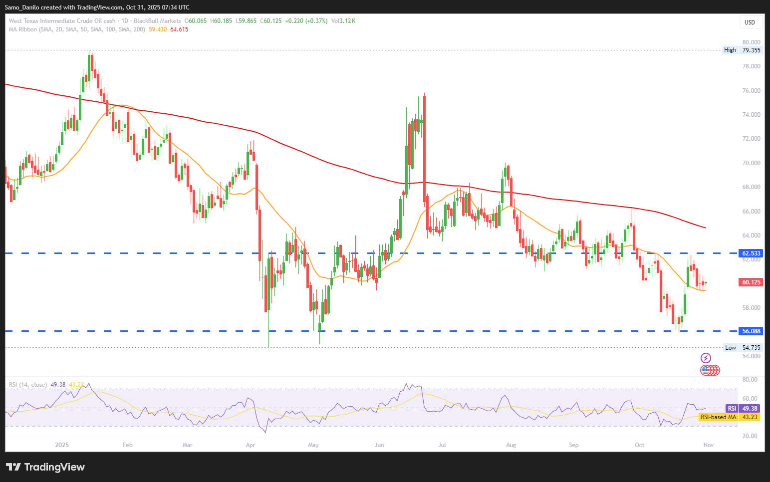 - US Data: With the US government still closed, traders face a data vacuum, redirecting attention toward Federal Reserve commentary for signals on the next policy move. Any dovish tone could support risk assets, indirectly benefiting oil demand expectations.