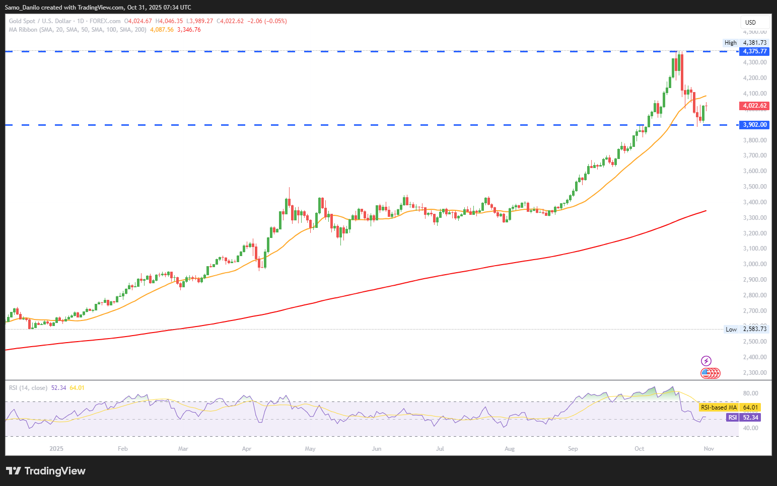 - XAU/USD Price: XAU/USD hovers just above $4015 during the European session on Friday, struggling to sustain early gains amid a mixed fundamental backdrop. The metal remains rangebound as investors weigh shifting Fed expectations against ongoing U.S. political tensions.